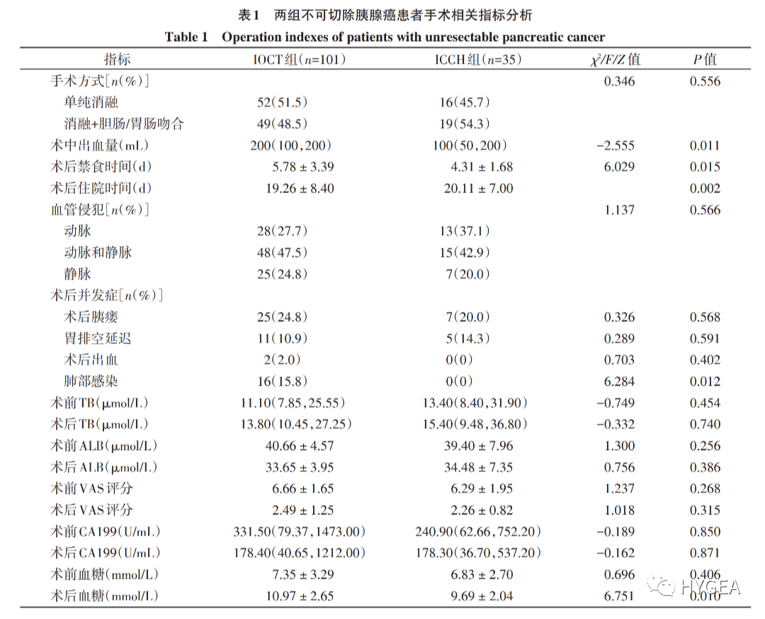 Objective:To comparethe therapeutic efficiency and risk of intraoperative cryoablation therapy(IOCT)and intraoperative combined cryoablation and hyperthermia(ICCH)in the treatment of unresectable pancreatic cancer. Methods:Patients with unresectable pancreatic cancer admitted to the Pancreatic Center of the Second Affiliated Hospital of Nanjing Medical University were divided into two groups:IOCT group(101 cases)and ICCH group(35 cases). The clinical data of patients were analyzed and surgical methods were compared. The incidence of postoperative complications,survival rate,tumor indexes and pain scores were compared in groups. Results:Compared with IOCT group,the intraoperative blood loss was less in ICCH group(P < 0.01). The postoperative fasting time in ICCH group was shorter than that in IOCT group(P < 0.01). The incidence and severity of postoperative complications in ICCH group were lower than those in IOCT group(P < 0.05). The 1?year survival rate of patients with pancreatic head carcinoma was significantly higher in ICCH group than in IOCT group(P=0.034). Conclusion:ICCH is more effective in the treatment of unresectable pancreatic cancer,with lower risk and lower complication rate than IOCT.