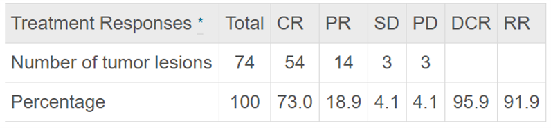 ① 术后 1 月肿瘤治疗反应:冷冻消融术后一个月肿瘤疾病控制率达95.9%。