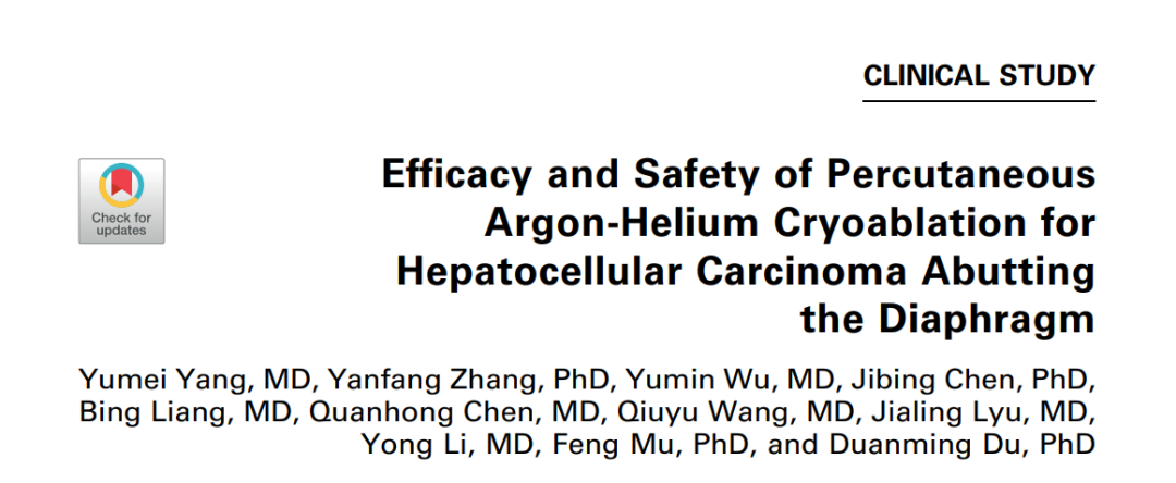 背景:由于一些原因,位于膈肌附近的肿瘤的热消融在技术上具有挑战性。首先,术中计算机扫描和超声检查无法清晰显示射频消融/微波消融切缘。第二,消融过程中不利的针分布和过热可能导致肝包膜破裂,并对膈、肺和心脏造成严重损伤。第三,即使使用人工腹水,仍有9~22%的患者因肝周粘连或肿瘤位置靠近肝表面而导致膈肌热损伤。冷冻消融可能是毗邻膈肌的HCC的一种有前途的治疗方法,因为在消融过程中使用CT和US可以很好地显示肿瘤边缘。尽管一些研究评估了在高危区域使用冷冻消融治疗HCC,但很少有研究针对膈肌临近区域。